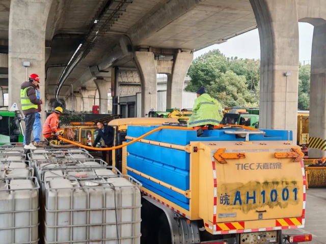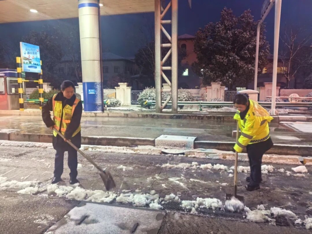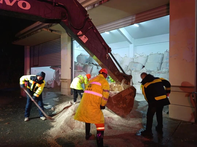 阜陽中心蘇阜園區保暢分中心養護人員在重點路段撒布融雪劑