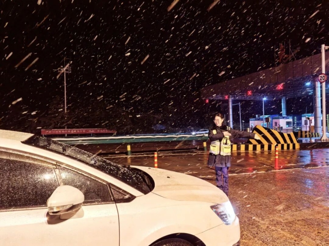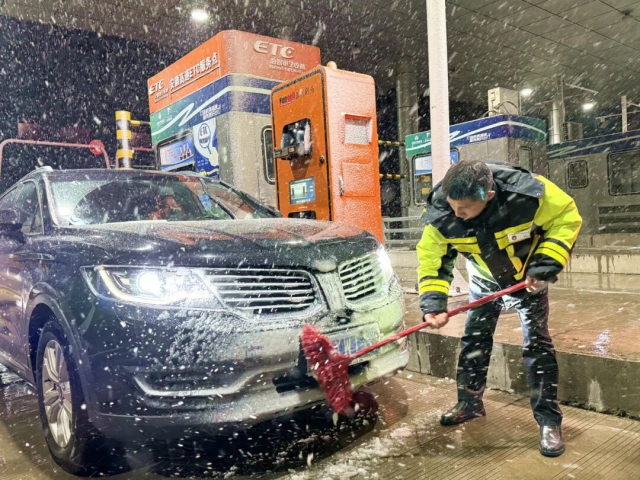 淮南中心鳳臺北站收費人員為車輛清理車牌積雪
