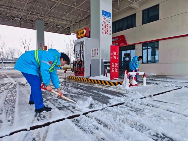 交控石油公司呂寨服務區加油站員工清掃站內積雪
