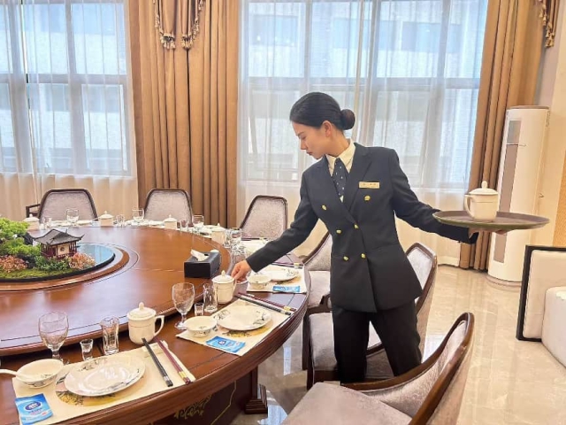 酒店公司金牌服務隊貼心管家正在準備餐具