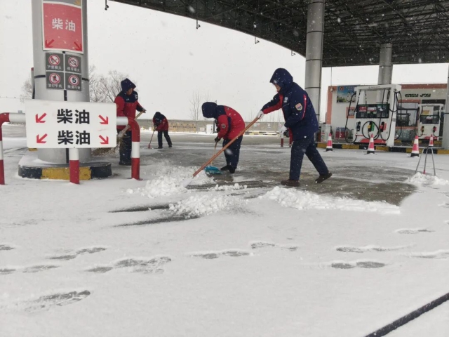 驛達(dá)服務(wù)區(qū)在易滑區(qū)域鋪設(shè)防滑墊并設(shè)置警示牌,在廣場、通道等易結(jié)冰路面,及時撒布融雪劑,并備足各類除雪防滑物資。依托“司機之家”“U+幸福驛站”等載體,組織志愿者為司乘提供姜茶熱飲、便民藥箱等貼心服務(wù)。加油站板塊統(tǒng)籌優(yōu)化資源調(diào)配,積極協(xié)調(diào)成品油資源,根據(jù)天氣預(yù)警情況,提前向受惡劣天氣影響的重點路段加油站增配庫存。各加油加氣站提前備足防滑墊、鐵鍬、掃帚等應(yīng)急物資,及時清理加油區(qū)及進(jìn)出口通道積雪。