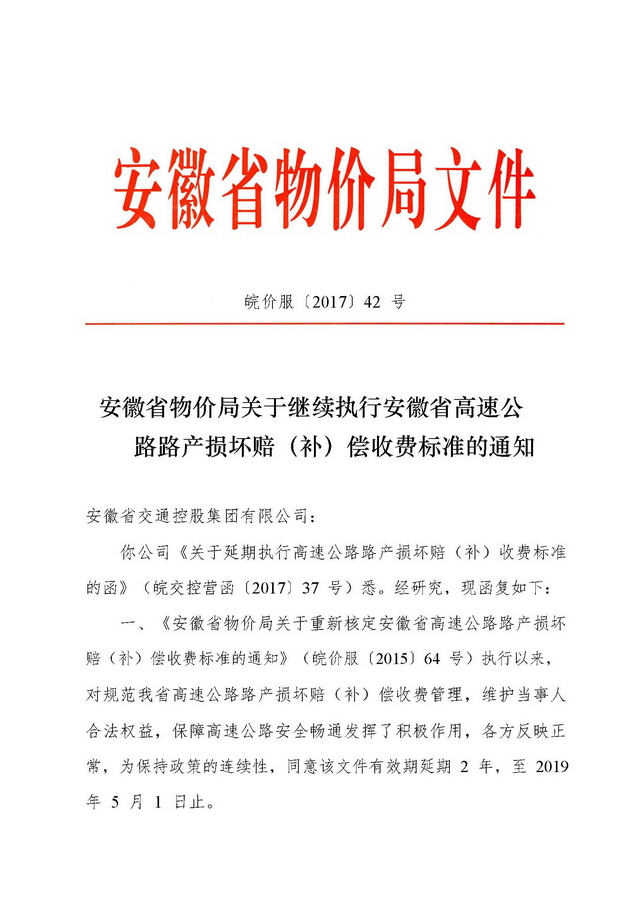 安徽省物價局關于繼續執行安徽省高速公路路產損壞賠(補)償收費標準的通知